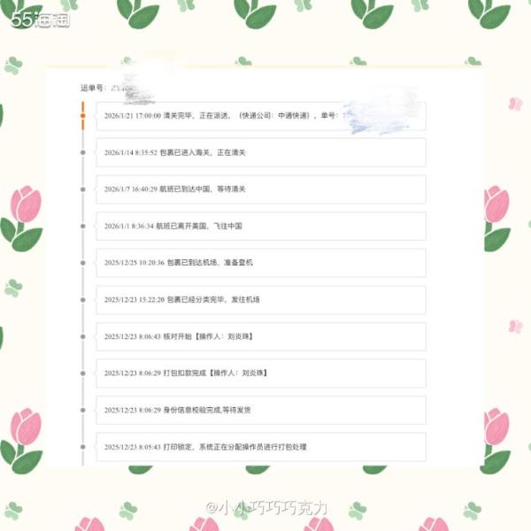 🌟转运详情:12.23分拣称重完毕-12.25包裹发往机场-1.1飞往中国-1.7到达国内,等待清关-1.14进入海关清关-1.21清关完毕,国内转运-1.23收到包裹