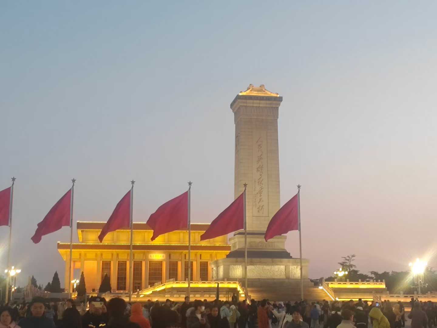 人民英雄纪念碑高大宏伟的立在天安门城楼的前方,因为人太多所以只能拍上半部分,本来想和这些建筑门合影留念的但是怕各种路人甲乙丙丁还是等白天找个人少的时间看看能不能拍照了。每次都是在电视里看到像英雄敬献花圈的直播,这次是真的直面,有一种激动油然而生。致敬先烈,人民的丰碑永存。
