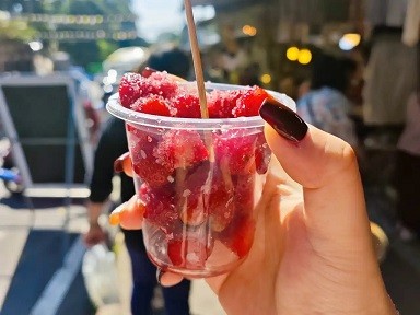 出景区后会有很多的小摊可以逛,朋友投喂的迷你小草莓,香气十足。