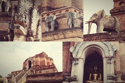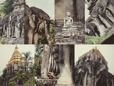 建筑风格融合了兰纳和 缅甸 的特色,寺内最著名也是最漂亮的建筑是——15只大象石雕承载的金色佛塔,赶时间都没有好好瞧瞧,找到一张10年前来时的存货照片。