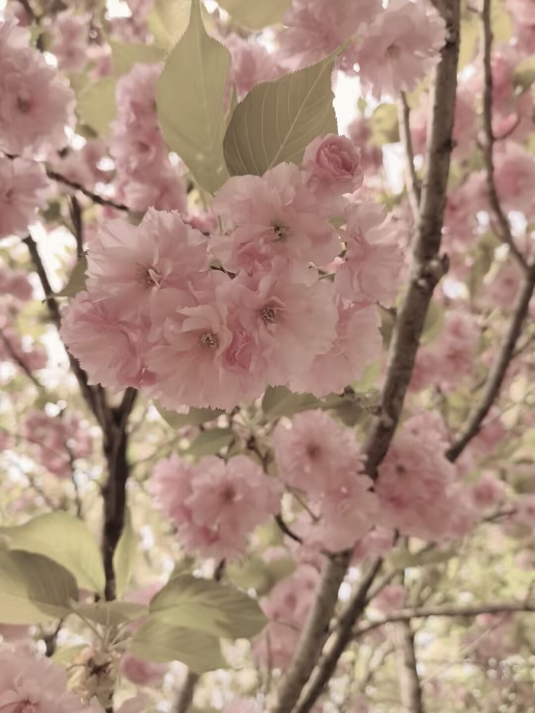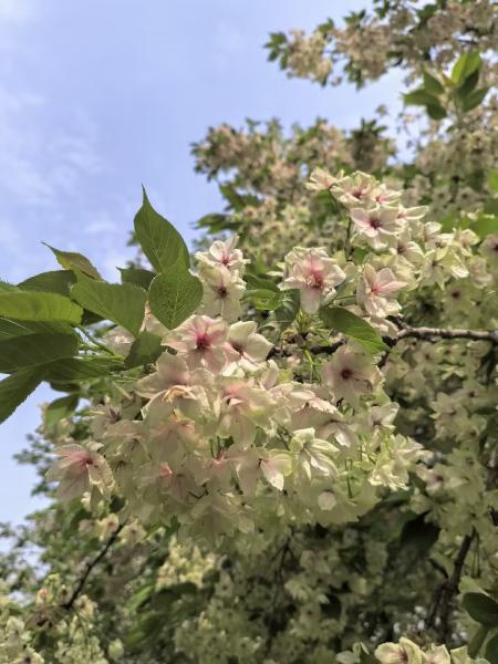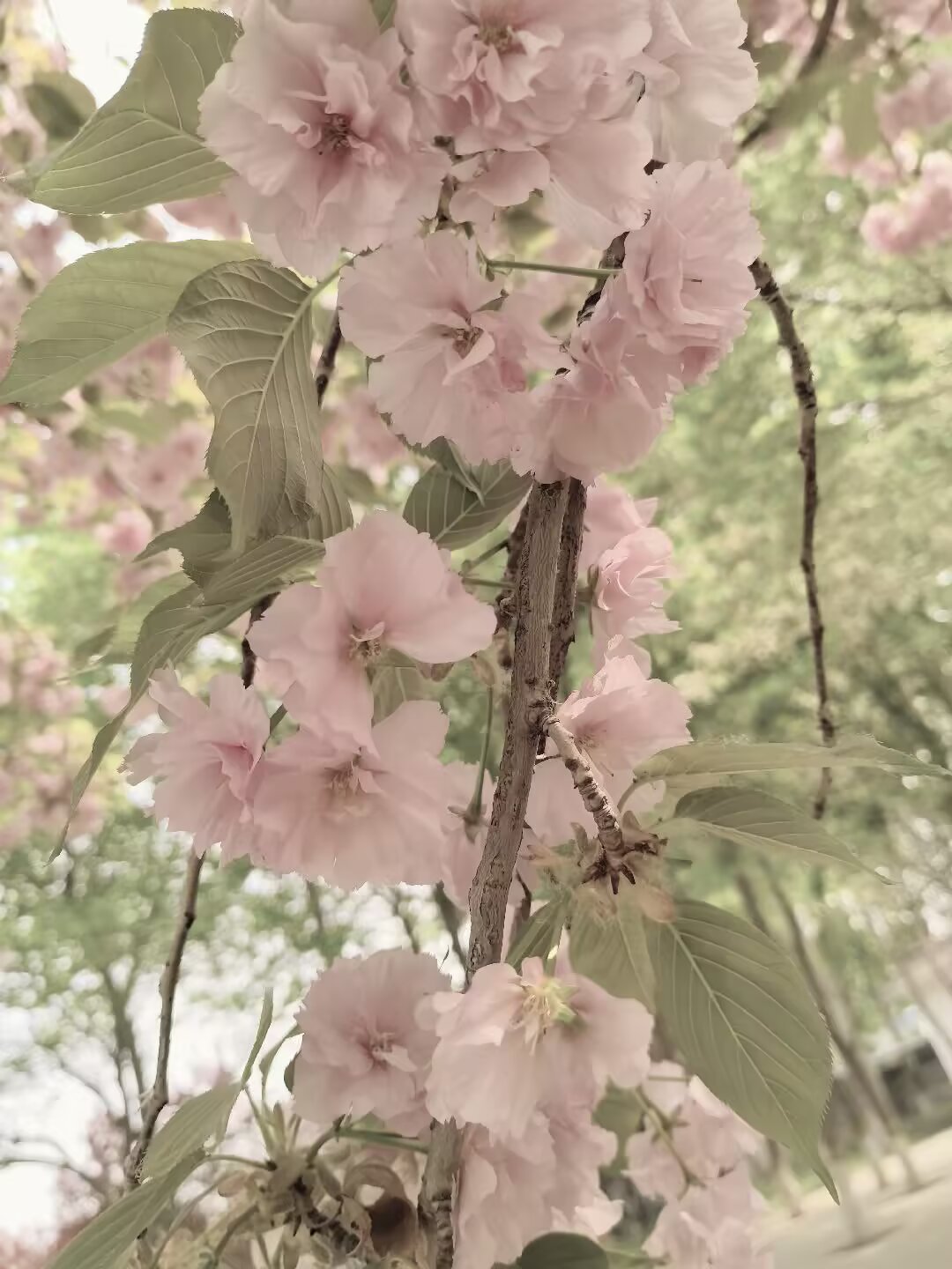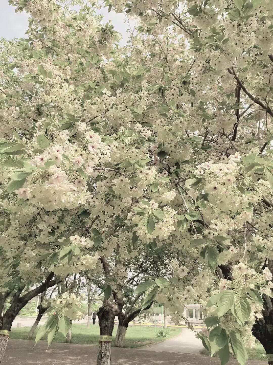 门口不远处就看到了郁金樱和关山樱,都属于晚樱品种。关山樱是粉红色,比较常见。郁金樱是白色花瓣,粉红花蕊,第一次看见,非常漂亮,极为震撼。可惜我拍的不好。