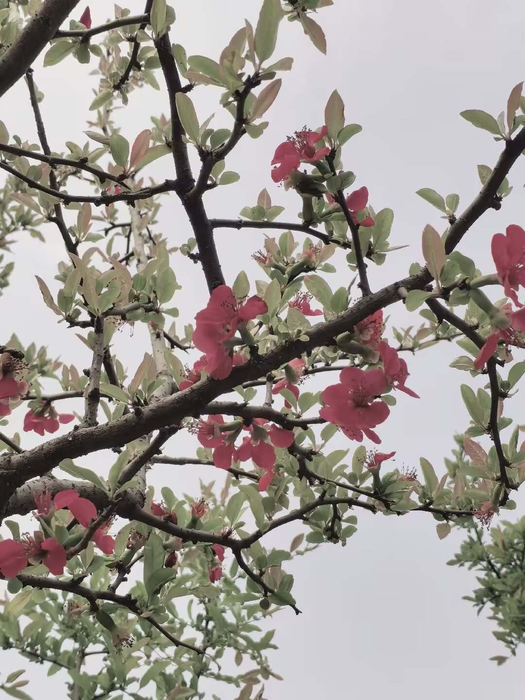 贴梗海棠基本上都谢了,只看见一株上还有点花朵。
