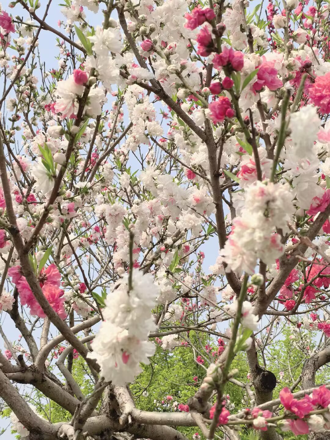 这是一株三色的洒金型碧桃,非常令人惊艳。